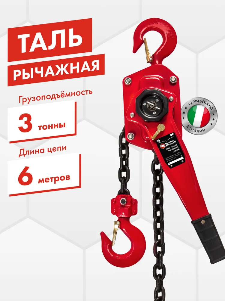 Мощная таль рычажная от итальянского бренда Quattro Elementi – ваш надежный помощник при ремонтных и строительных работах! Грузоподъемность 3000 кг и длина цепи 6 метров позволяют легко поднимать тяжелые предметы без лишних усилий. Идеально подходит как для профессионального использования, так и на даче или дома. Надежно, безопасно и просто – выбирайте качество европейского уровня уже сейчас!