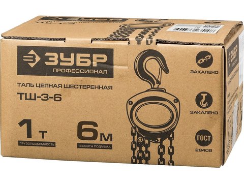 Таль цепная "ТШ-1-6" шестеренная, ЗУБР Профессионал 43082-1, 1т / 6м - предназначена для использования на строительных площадках, складах, пристанях, в гаражах и цехах для погрузки и разгрузки, размещения оборудования. Особенно удобны для проведения подъемных работ на открытых пространствах при отсутствии источника электроэнергии. Данное изделие управляется тяговой цепью и не требует подключения к электричеству. Все элементы изделия изготовлены из высококачественной углеродистой стали. Грузовая цепь закалена. Надежный тормозной механизм на основе фрикционных дисков. Оптимальное передаточное число обеспечивает эффективную работу при небольшом усилии на тяговую цепь. Вся конструкция обладает повышенным запасом прочности.