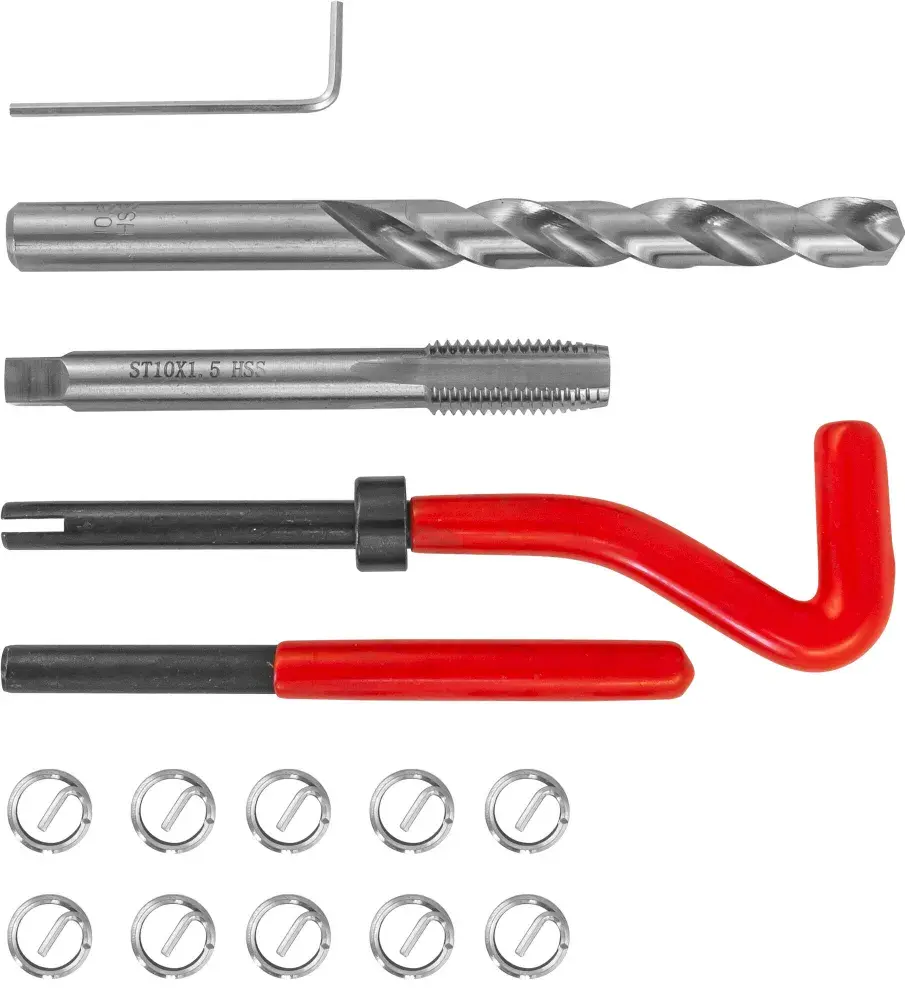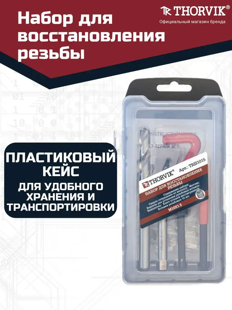 Профессиональный комплект Thorvik TRIS1015 включает все необходимое для качественного восстановления резьбы размера M10х1.5. В состав набора входят 15 тщательно отобранных инструментов и материалов, обеспечивающих точное восстановление поврежденной резьбы без необходимости замены крепежных элементов. Комплект упакован в удобный пластиковый контейнер для хранения. Код изделия: 53177. Подходит для бытового и профессионального использования при ремонте автомобилей, оборудования, сантехники и строительстве.