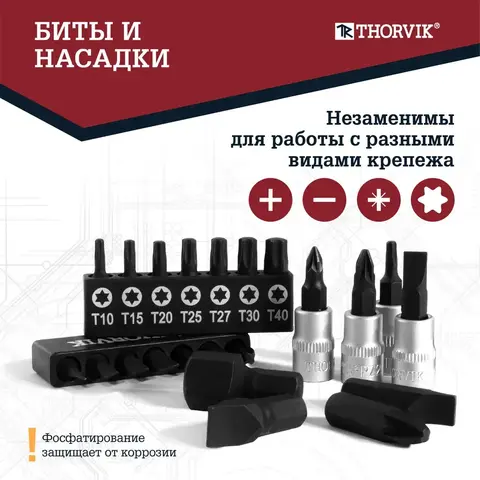 В набор входят: ударные головки, шестигранники, биты, удлинители, карданы, трещотки, вороток-отвертка, переходник. Материал инструментов - хромованадиевая сталь (CrV), прочный и долговечный материал, устойчивый к коррозии. Все инструменты упакованы в удобную пластиковую сумку для хранения и транспортировки.