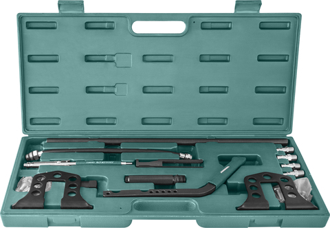 Приспособление для сжатия возвратных пружин клапанов газораспределительного механизма ДВС. Применятся при производстве работ по обслуживанию ГРМ ДВС без необходимости демонтажа головки блока цилиндров благодаря подаче в камеру сгорания магистрального сжатого воздуха, поддерживающего клапана в верхнем положении, тем самым предотвращая возможность падения клапана в цилиндр. Опоры штанги устанавливаются на монтажные элементы ГБЦ, штанга устанавливается в отверстия опор в зависимости от положения обслуживаемого клапана, на Г-образном рычаге устанавливается толкатель тарелки пружины клапана. Сжатый воздух подается через свечные отверстия с помощью входящего в комплект шланга и, при необходимости, дополнительного адаптера.