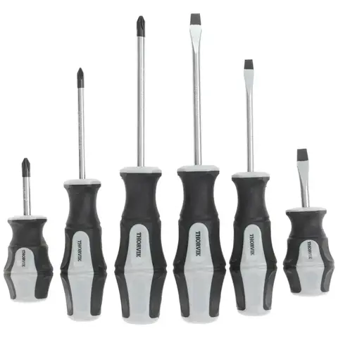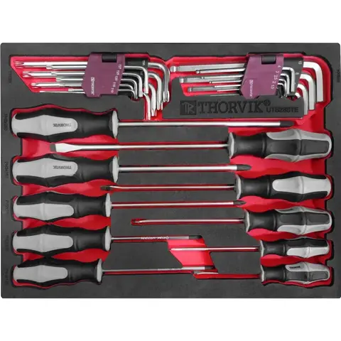 Отвертки Thorvik снабжены оригинальными композитными бензомаслостойкими рукоятками, обеспечивающими надежный захват инструмента при работе, благодаря правильному сочетанию мягкой и твердой частей элемента. Стержни, закрепленные в рукоятке с особой прочностью. Рабочие части закалены до высокой твердости и намагничены. При производстве ложементов Thorvik используется двухкомпонентный материал с плотностью по Шору 40А. Область применения: Набор стержневых отверток, включающий в себя дополнительно 2 набора торцевых шестигранных ключей предназначен для работы с крепежными соединениями с разлизличным внутренним профилем.