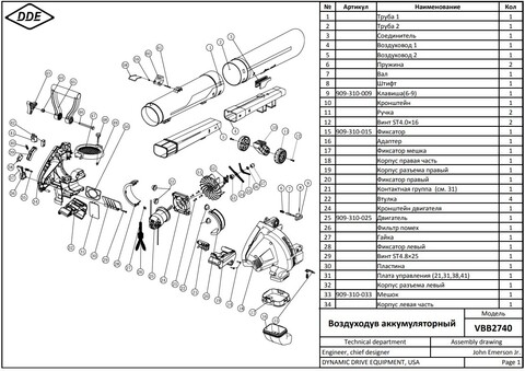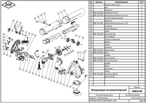 Воздуходув аккумуляторный DDE BlueTech VBB 2740 (обдув 270 м3/ч, скор., 52 м/с, всас-е 590 м3/ч, скор., 46 м/с, сборник, без ЗУ и АКБ)