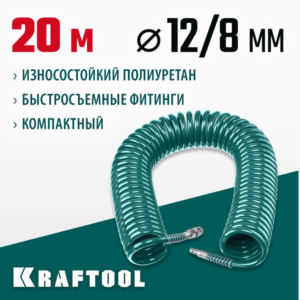 Воздушный спиральный шланг KRAFTOOL 20 м, 8х12 мм, 15 бар с фитингами рапид. Идеально подходит для использования с пневмоинструментами в автомастерских и на производстве. Изготовлен из прочного материала, обеспечивающего долговечность и надежность. Подходит для профессионалов и любителей.
