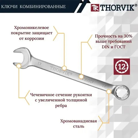 Гаечные ключи Thorvik изготовлены из современных материалов и по технологиям отвечающим жестким требованиям международных и отечественных стандартов. Привычное чечевичное сечение рукояток, устойчивое к агрессивным и механическим воздействиям гальваническое покрытие, разнообразие областей применения, широта размерного ряда, удобные средства хранения наборов ключей, надежность и долговечность делает инструменты Thorvik достойным помощником мастера. При производстве работ по обслуживанию продукции машиностроения используются различные резьбовых крепежных деталей и мастеру в этой ситуации необходимо иметь несколько инструментов, необходимых для выполнения такой работы. При этом извлечение требуемого ключа из, скажем, кармана комбинезона не всегда доставляет требуемый результат и чем больше обслуживаемых размеров, тем выше вероятность ошибки. В таком случае, необходим набор ключей, где каждый ключ имеет отдельный, маркированный по размеру, карман в мягком планшете, именуемом "скруткой", изготовленном из устойчивого к истиранию, пропитанного для защиты от влаги и загрязнений материала. Подбор инструмента, его хранение и транспортировка такое предложение достаточно просто решает. Область применения Ключи гаечные комбинированные ключи - универсальные гаечные ключи, совмещающие в себе функционал и преимущества рожковых и накидных ключей. Зевы комбинированных ключей имеют одинаковые . Именно сочетание сильных сторон рожковых и накидных ключей и нивелирование сторон слабых делают комбинированные ключи исключительно широко востребованными со стороны потребителей и применяемыми в самых разных сферах - производственной, ремонтной, авторемонтной, бытовой и других. Ключи гаечные с открытым и кольцевым зевами предназначены для монтажа либо демонтажа резьбовых соединений.