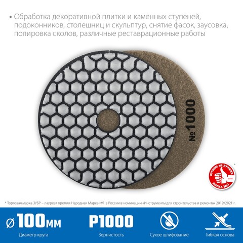 Алмазный гибкий шлифовальный круг «ЗУБР» — ваш надежный помощник при сухом шлифовании бетона! Высокоточная обработка (№1000) обеспечивает гладкую поверхность без усилий. Удобная форма круга позволяет легко достигать труднодоступных мест. Диск диаметром 100 мм идеально подходит как профессионалам, так и новичкам. Продукт серии «Профессионал» гарантирует качество и долговечность работы от известного бренда ЗУБР.