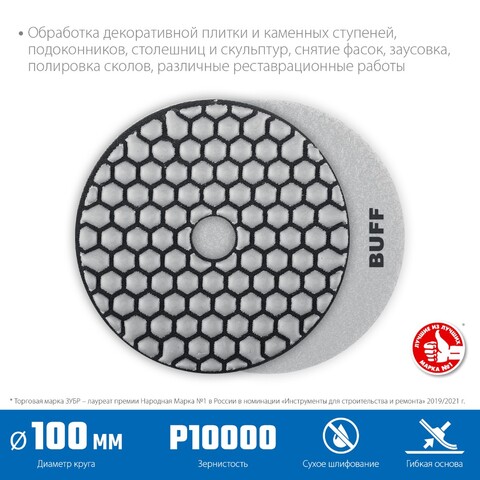 Алмазный гибкий шлифовальный круг ЗУБР 100 мм, №10000 — идеальный выбор профессионалов! Обеспечивает точное и чистовое сухое шлифование поверхностей из бетона с высокой эффективностью. С этим инструментом ваш ремонт станет быстрее, качественнее и удобнее! Купить можно уже сейчас: безупречное качество от надежного бренда ЗУБР по доступной цене!