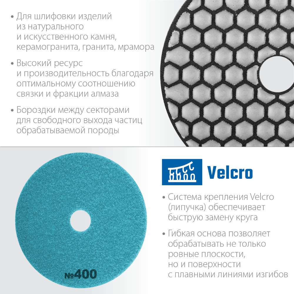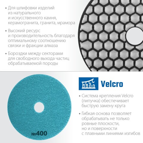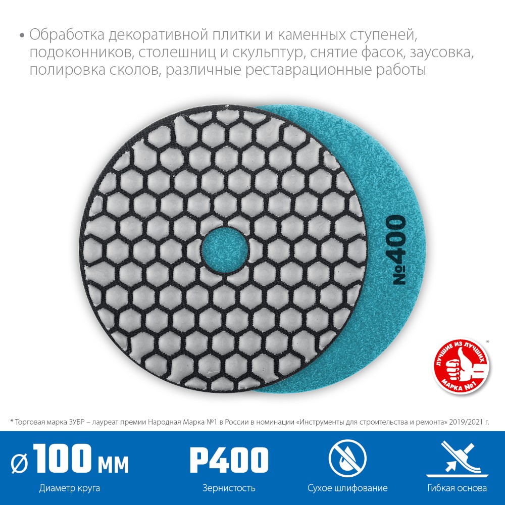 Алмазный гибкий шлифовальный круг ЗУБР 100 мм №400 — ваш надежный помощник при сухом шлифовании бетона! Высокоточная обработка поверхностей становится легкой и быстрой благодаря профессиональной формуле алмаза. Агрессивный профиль обеспечивает эффективное удаление материала, а оптимальное зерно гарантирует ровную поверхность без дефектов. Идеален для мастеров, знающих толк в качестве!