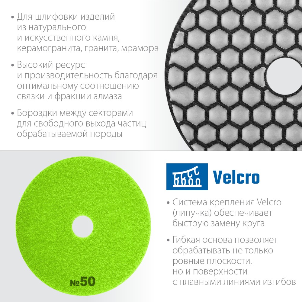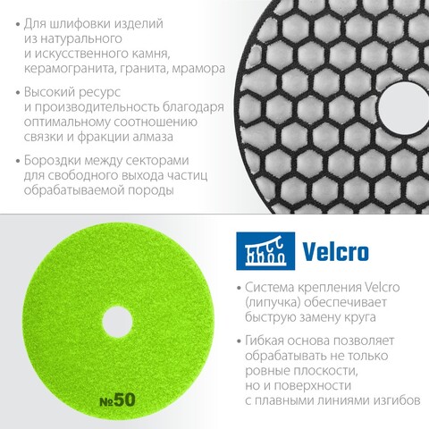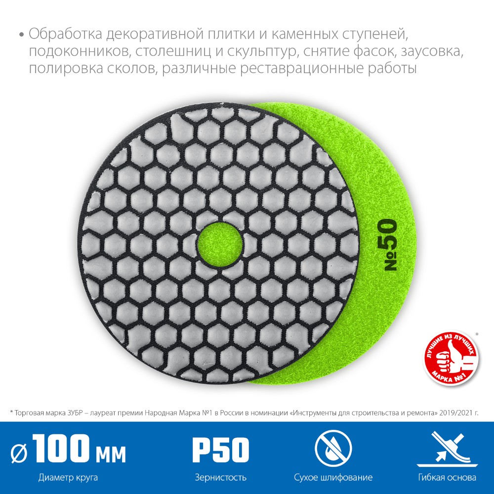 Алмазный гибкий шлифовальный круг ЗУБР 100 мм, №50 — профессиональный инструмент высокого класса точности для сухого шлифования бетона! Идеально подходит для выравнивания поверхностей, удаления цементного молочка и придания гладкости. Подходит как профессионалам строительного дела, так и мастерам-самоучкам для домашних ремонтов и работ на даче. Гибкость круга обеспечивает удобство обработки сложных форм и углов. Надежность бренда ЗУБР гарантирует качество каждого оборота!