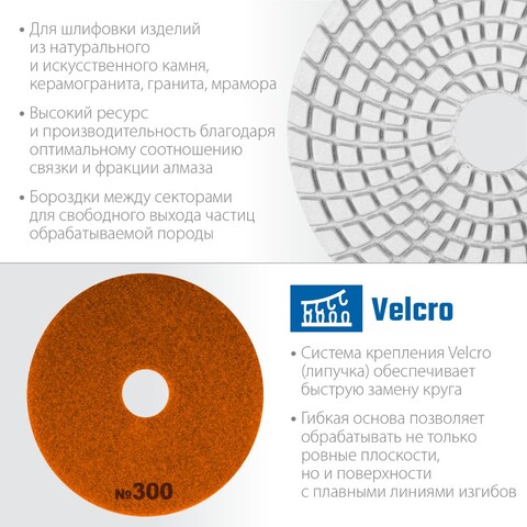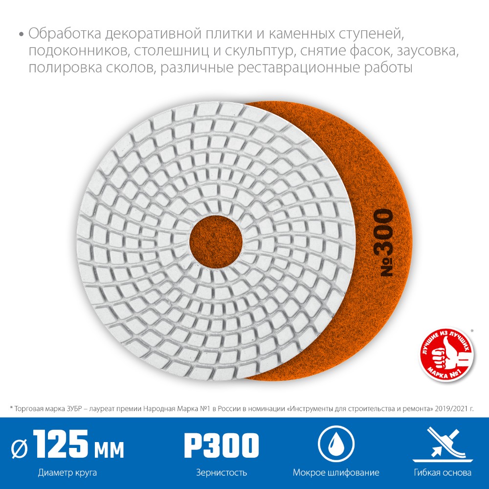 Алмазный гибкий шлифовальный круг ЗУБР 125 мм №300 — ваш надежный помощник при профессиональном мокром шлифовании бетона! Высокоточная обработка поверхностей благодаря качественным абразивным частицам. Быстрое достижение идеального результата без лишних усилий и износа оборудования. Идеально гладкая поверхность каждый раз! Гарантия надежности от известного бренда ЗУБР!