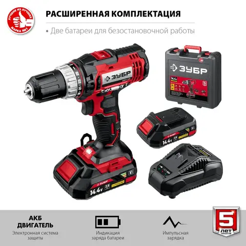 ЗУБР 14.4В, 2 АКБ (2Ач), в кейсе, дрель-шуруповер,Мастер. ДШЛ-145-22.