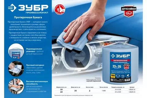 Протирочная бумага ЗУБР 12820-33, применяется для протирания и полировки различных поверхностей. Прочный материал эффективно удаляет масло, жир, грязь. Высокая впитывающая способность для использования на производстве и в домашнем хозяйстве.