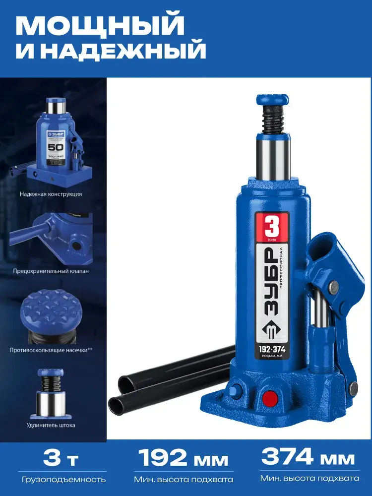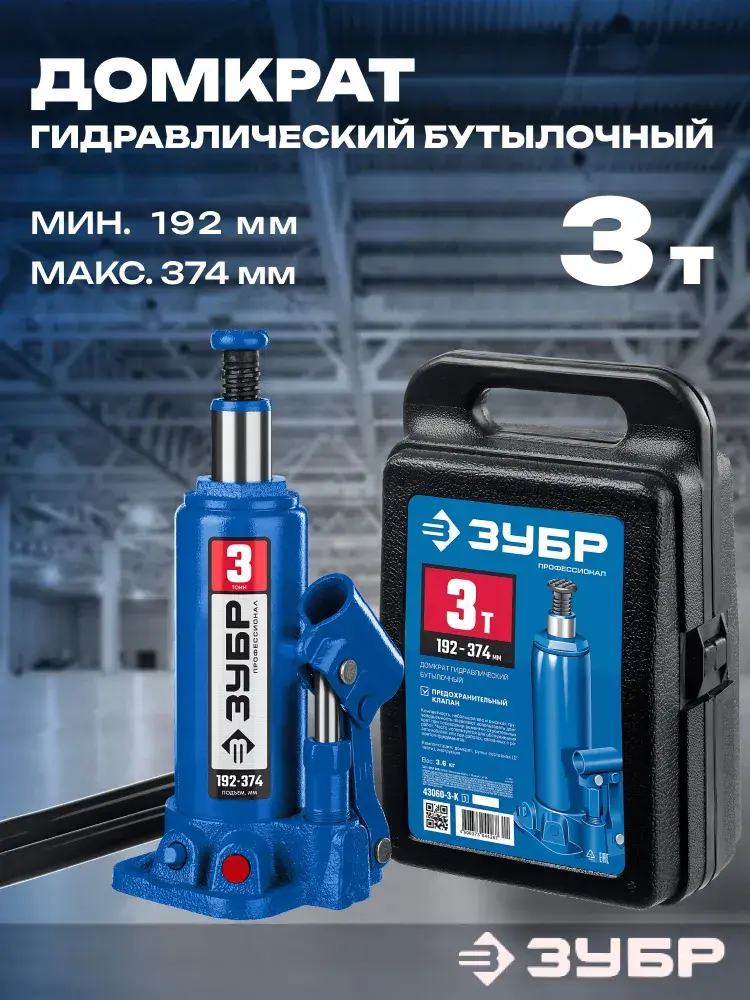Откройте для себя мощьПрофессионалного инструмента! С гидравлическим домкратом "ЗУБР 3т" любые задачи по подъёму грузов до 3 тонн становятся лёгкими и безопасными. Компактный дизайн, диапазон работы от 192 до 374 мм и надёжность исполнения делают его незаменимым помощником как дома, так и на стройплощадке. Удобный прочный кейс обеспечивает защиту и упрощает хранение и транспортировку. ПриобретайтеПрофессионалный инструмент – работайте уверенно вместе со ЗУБРом!