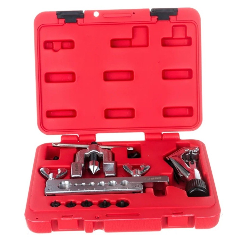 Набор «ЗУБР 4 – 18 мм» — ваш надежный помощник при работе с трубопроводами! Метрическая система резок обеспечивает точность и удобство применения. Для удобства пользователей включено 7 матриц и инструмент для развальцовки. Подходит для труб диаметром от ½" до ¾". Это практичное решение позволит вам быстро и качественно выполнить монтажные работы, сэкономив время и силы. Удобно, надежно, эффективно — выбирайте лучшее вместе с «ЗУБРОМ»!