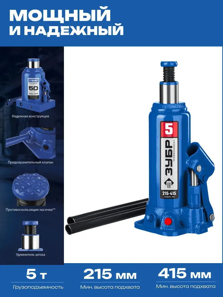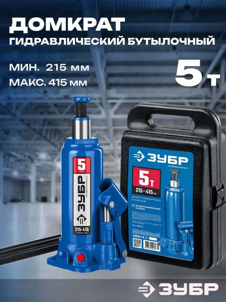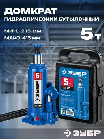 Домкрат бутылочный гидравлический ЗУБР 5т — надёжность и мощностьПрофессионалного инструмента! Выполнен из высококачественных материалов, обеспечивает подъём груза весом до 5 тонн, рабочая высота от 215 до 415 мм. Удобство использования гарантируется продуманной конструкцией и точностью изготовления. Идеален для автосервиса, строительства и ремонта. Надежность, проверенная временем!