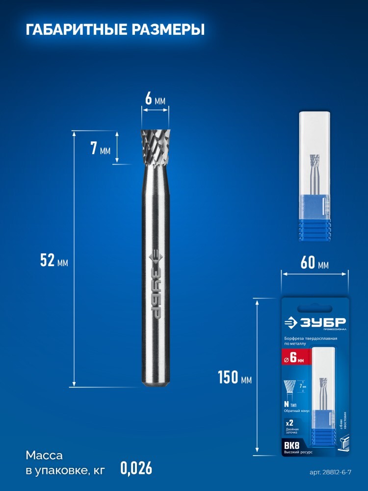 Твердосплавная борфреза ЗУБРПрофессионалидеально подходит для обработки металлических поверхностей благодаря обратному конусу под углом 10°, обеспечивающему точное и чистое резание. С диаметром хвостовика 6 мм и рабочей частью 7 мм инструмент легко справляется даже со сложными задачами. Удобен в использовании совместно сПрофессионалными электроинструментами. Улучшенная износостойкость продлевает срок службы изделия, снижая затраты на расходники.