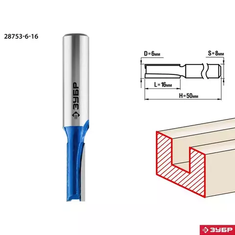ЗУБР 6 x 16 мм, хвостовик 8 мм, фреза пазовая прямая 28753-6-16Профессионал