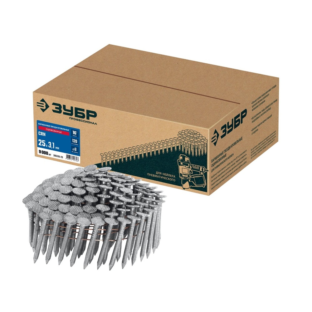 Барабанный комплект оцинкованных кровельных гвоздей ЗУБР CRN 25х3.1 – надёжность и удобство при монтаже кровли! Высокое качество защиты от коррозии обеспечивает долгий срок службы конструкции. Удобная упаковка содержит целых 9 тысяч гвоздей, что значительно экономит время и средства при масштабных работах. Надежно, выгодно и доступно именно у нас!