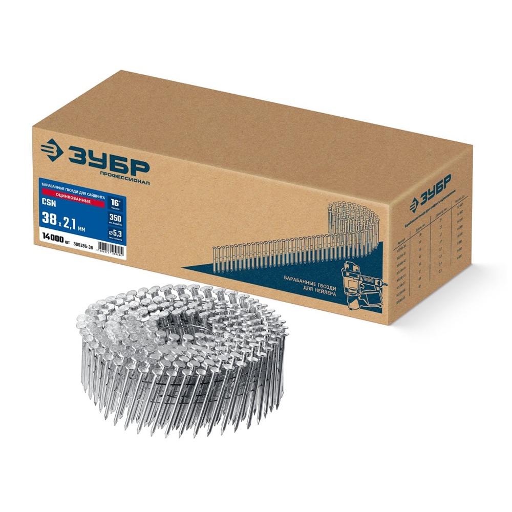 Гвозди "ЗУБР" 38х2.1мм – ваш надежный помощник при монтаже сайдинга! Оцинкованное покрытие обеспечивает защиту от коррозии, продлевая срок службы конструкции. 14 тысяч штук в упаковке позволяют быстро и эффективно выполнить даже крупный объем работ. Купите барабанную упаковку качественных строительных материалов по выгодной цене и оцените удобство работы с профессиональным крепежом прямо сейчас!