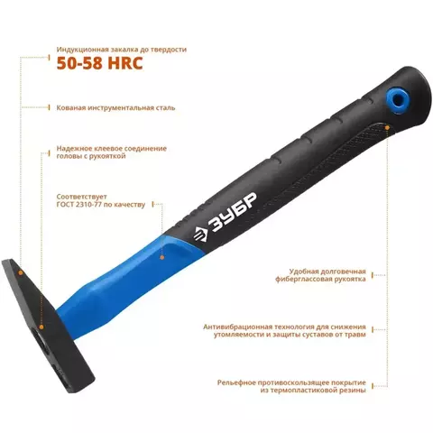 Молоток слесарный ЗУБР 20020-02_z01, предназначен для слесарно-монтажных работ. Двухкомпонентная фиберглассовая рукоятка. Рабочие поверхности головы закалены индукционным методом.