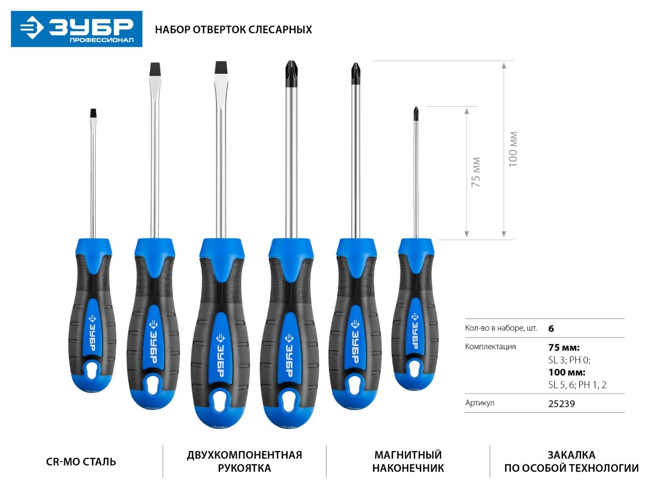 ЗУБР 6 шт, отверткиПрофессионалные с магнитным наконечником 25239Профессионал
