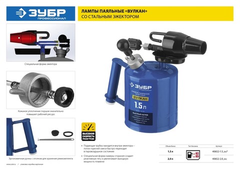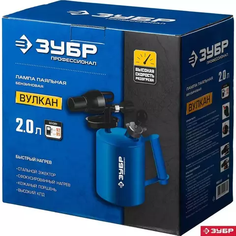 Лампа паяльная ЗУБР 40652-2.0_z02, предназначена для получения направленного факела пламени высокой температуры и применяется в производственных и бытовых условиях для проведения паяльных, термических и других видов работ, допускающих открытый нагрев. Лампа проста по конструкции, удобна и надежна в эксплуатации. Отличается длительным временем работы на одной заправке. Стабильная работа при низких температурах. Применяется для нагрева до высокой температуры различных деталей. Чугунный эжектор обеспечивает стабильную работу. Защитный кожух обеспечивает правильное направление струи горючей смеси даже при сильном боковом ветре. Уплотнение поршня изготовлено из натурального материала, что значительно увеличивает срок службы. Увеличенный диаметр насоса. Эргономичная геометрия ручки с отсеком для хранения ремкомплекта. Долгая работа на одной заправке, благодаря небольшому расходу горючего.