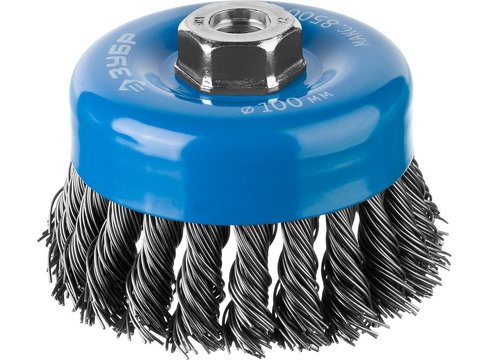 ЗУБР "ПРОФЕССИОНАЛ". Щетка чашечная для УШМ, плетеные пучки стальной проволоки 0,8мм, 100ммхМ14 35277-100_z02, применяются для удаления ржавчины, шлаков, окалины с металлических поверхностей. Идеально подходят для обработки сварных швов, отливок из чугуна, стали и цветных металлов.