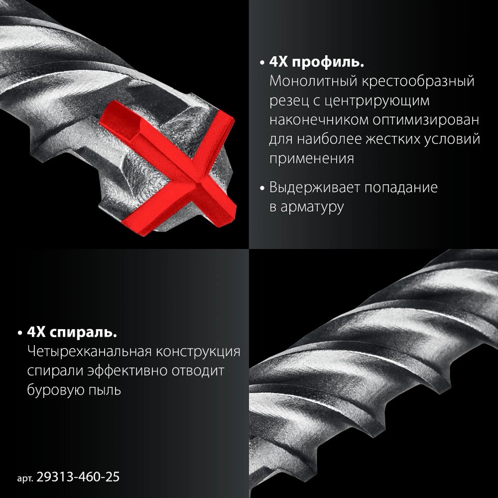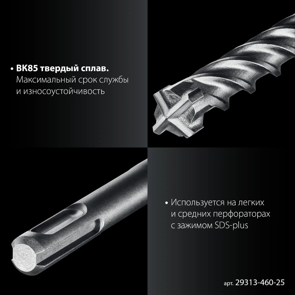 Бур «ЗУБР ПРОФИ-4Х» 25х460 мм – ваш надежный помощник при работе с бетоном! Стандарт SDS-plus обеспечивает надежную фиксацию и устойчивость инструмента. Большой диаметр и оптимальная длина позволяют быстро и эффективно справляться даже со сложными задачами. Надежность бренда ЗУБР гарантирует качество каждого сверления.